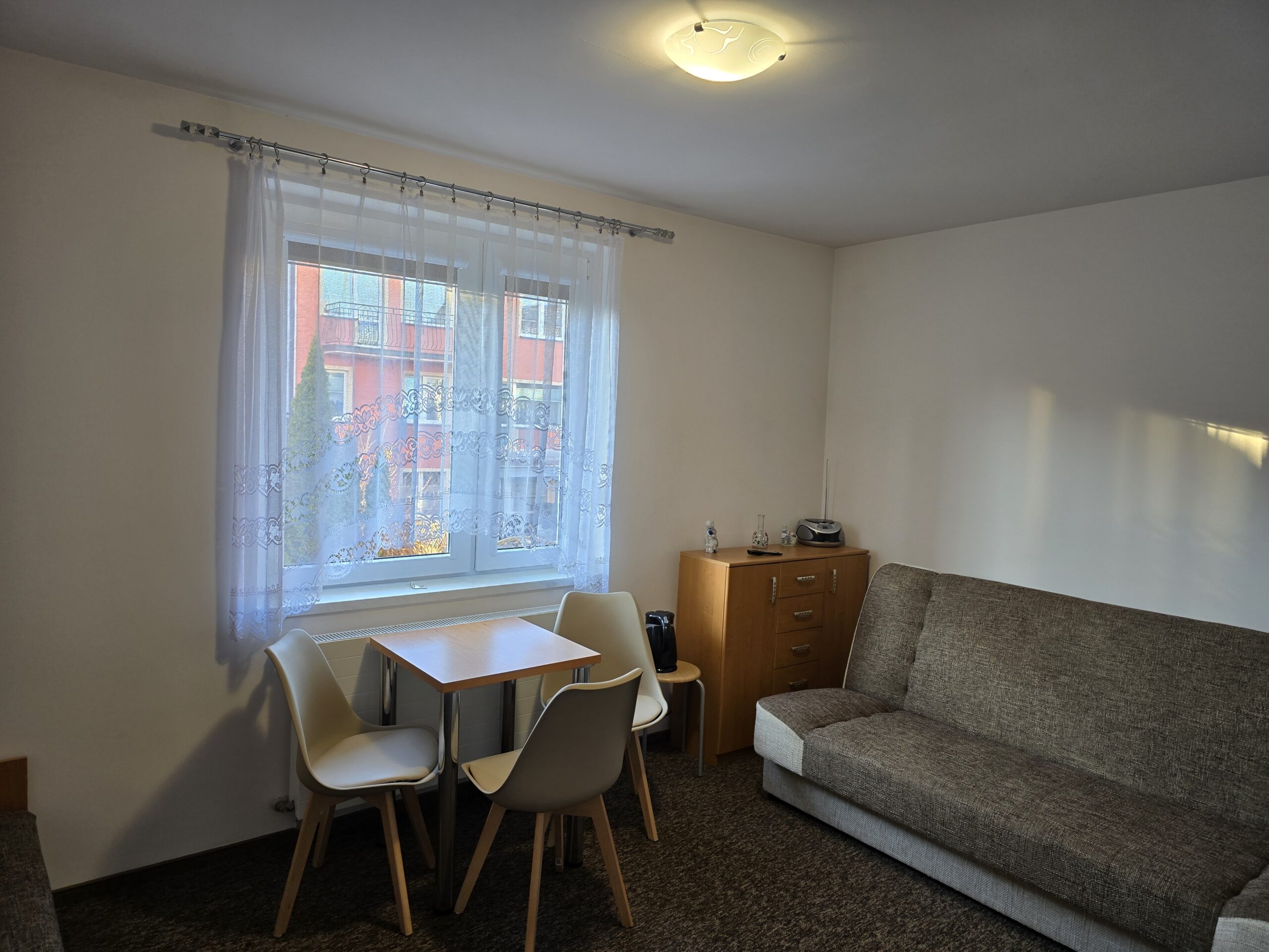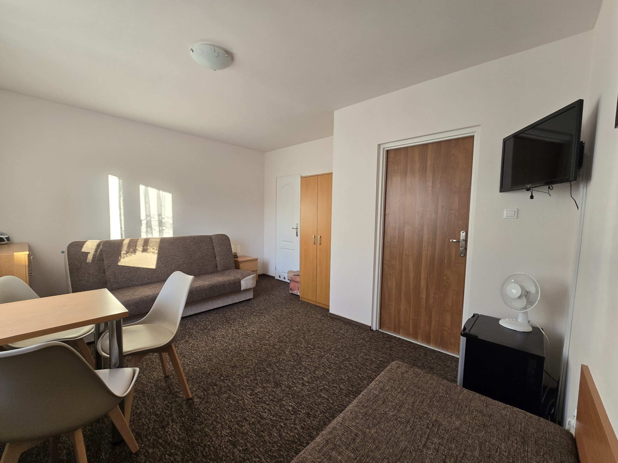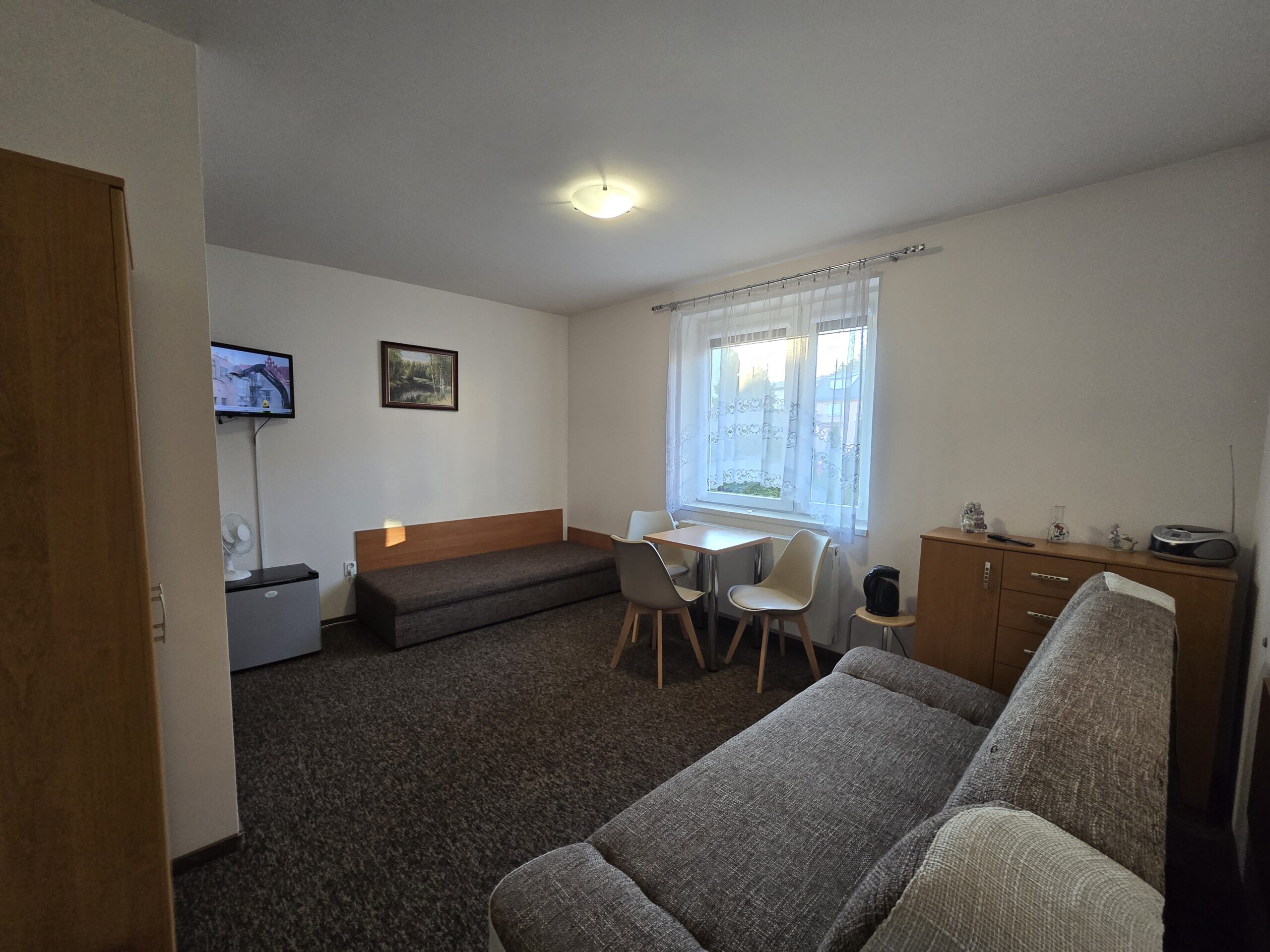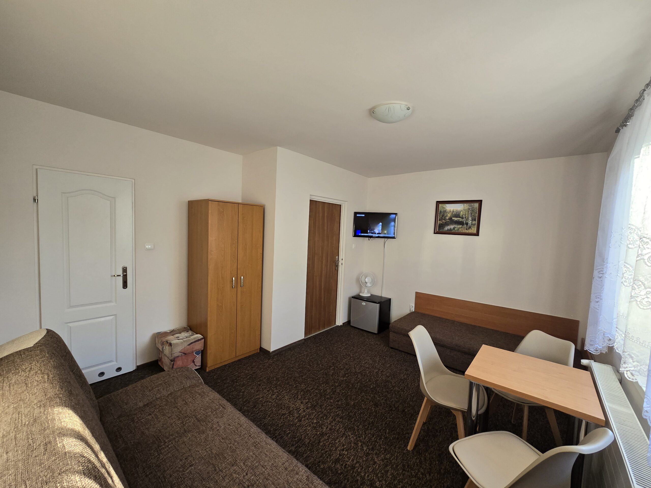 Pokój nr. 3, 2-3 osobowy – I piętro. Wyposażenie: Telewizor 30″ led, czajnik elektryczny, pościel, podwójna wersalka i wygodny tapczan, szafa, stół i krzesła, lodówka, podstawowy zestaw naczyń.