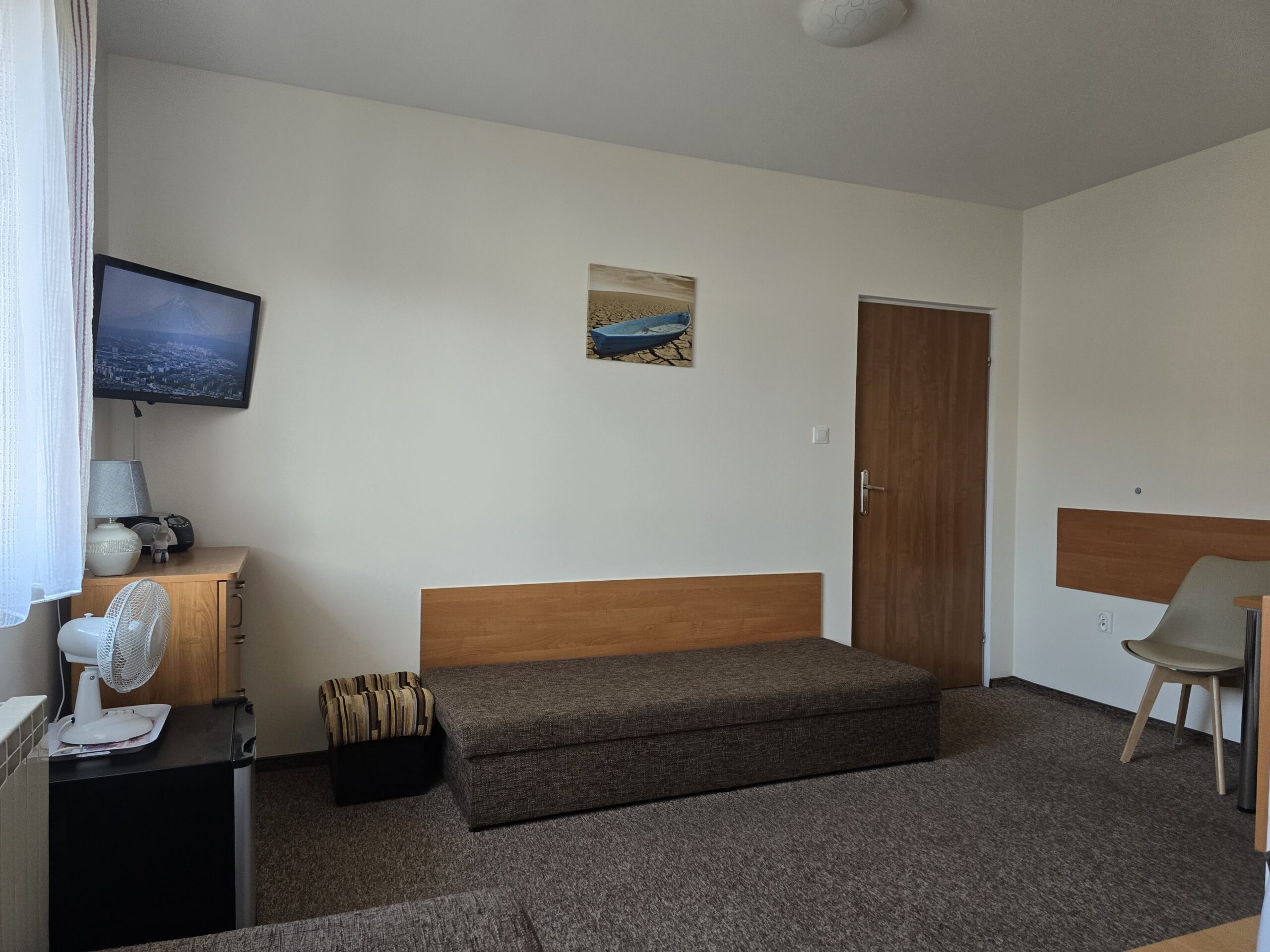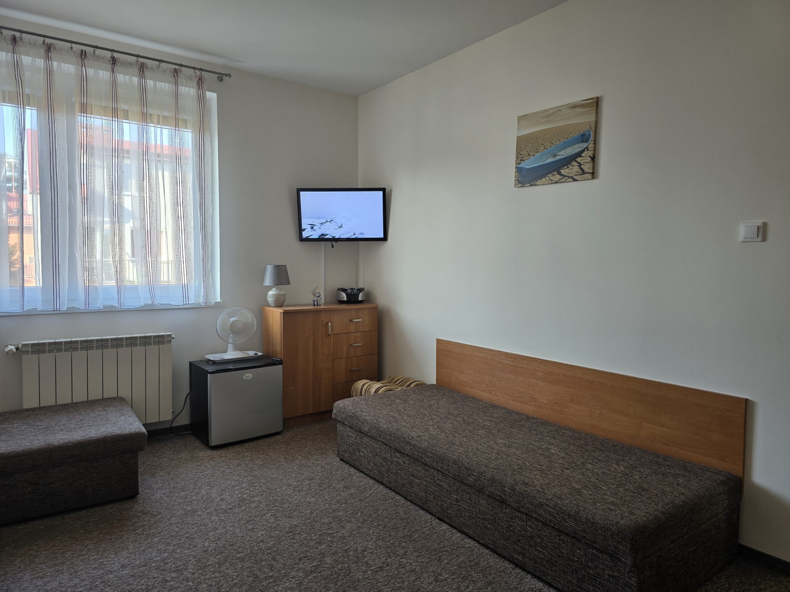 Ustka – Pokój nr. 5, 2 osobowy – II piętro. Wyposażenie: Telewizor 30″ led, czajnik elektryczny, pościel, dwa wygodne tapczany, szafa, stół i krzesła, lodówka, podstawowy zestaw naczyń.