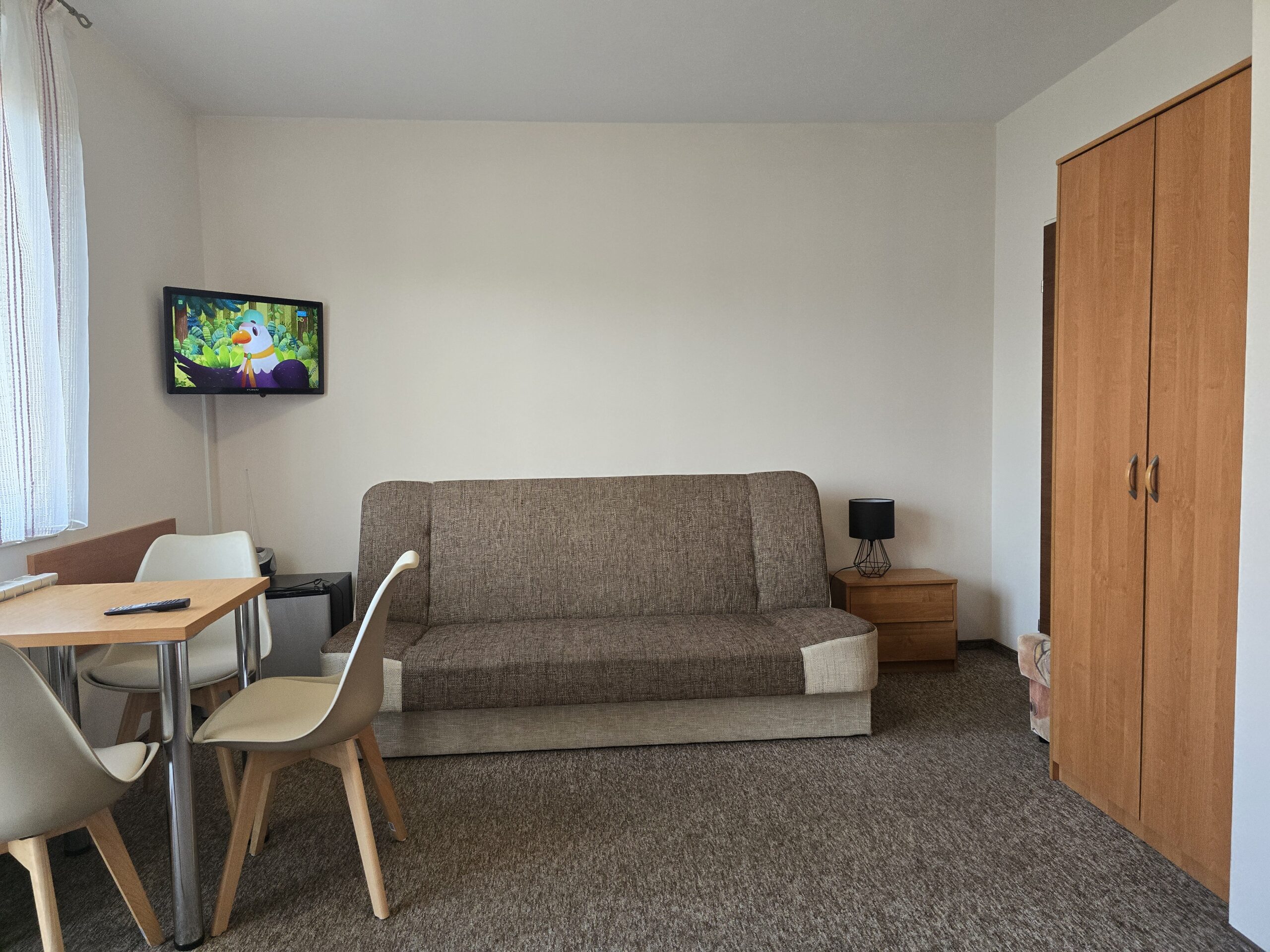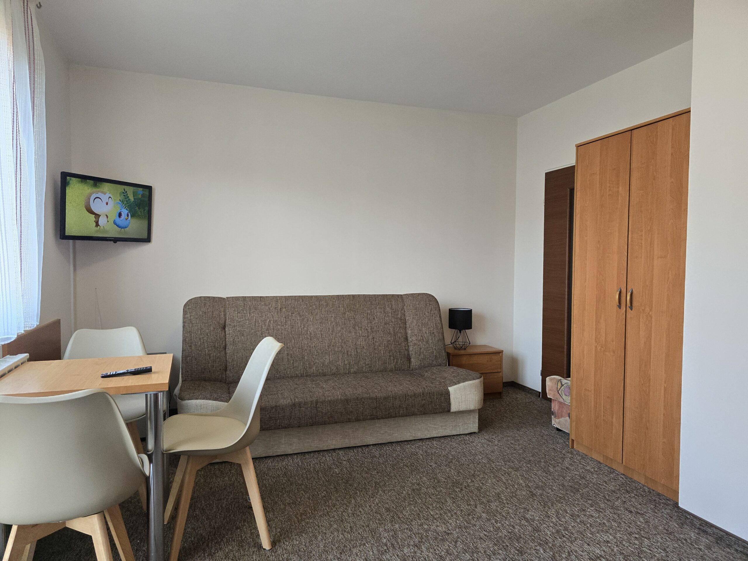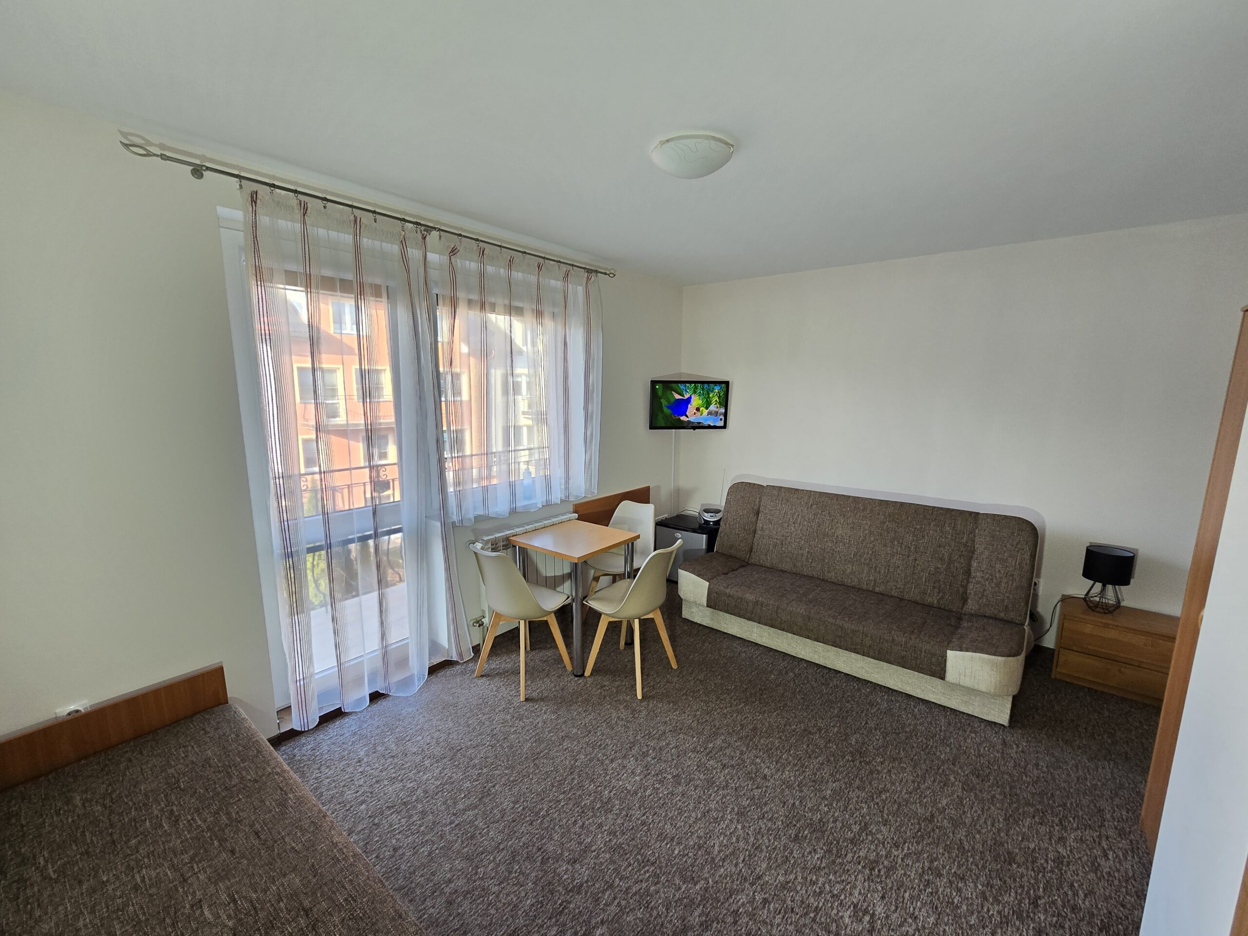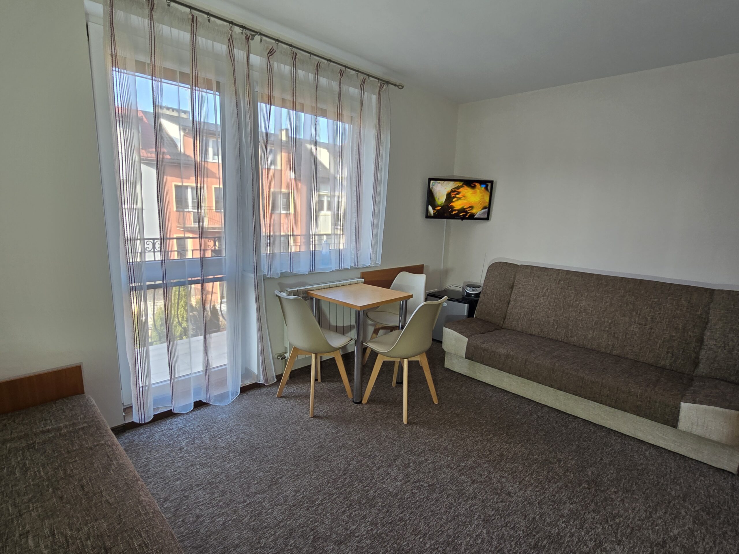 Pokój nr. 6, 2-3 osobowy z balkonem – II piętro. Wyposażenie: Telewizor 30″ led, czajnik elektryczny, pościel, podwójne łóżko, wygodny tapczan, szafa, stół i krzesła, lodówka, podstawowy zestaw naczyń.