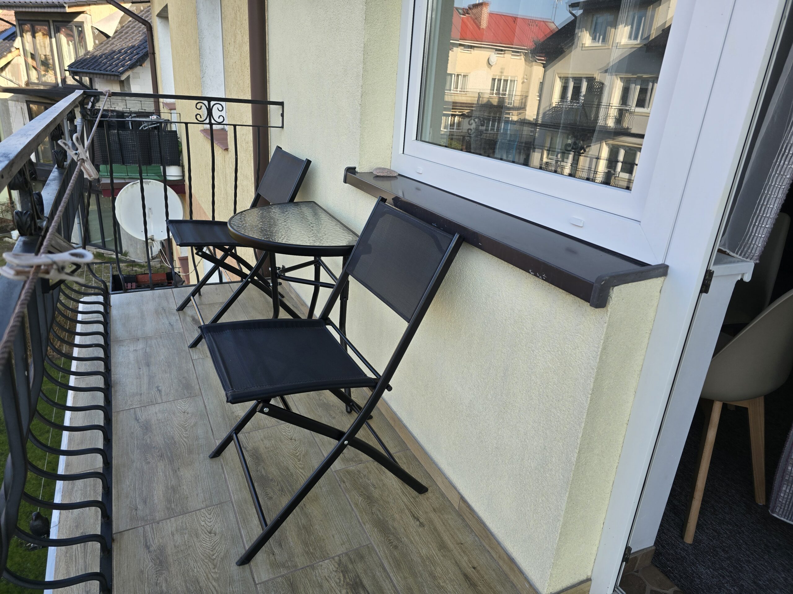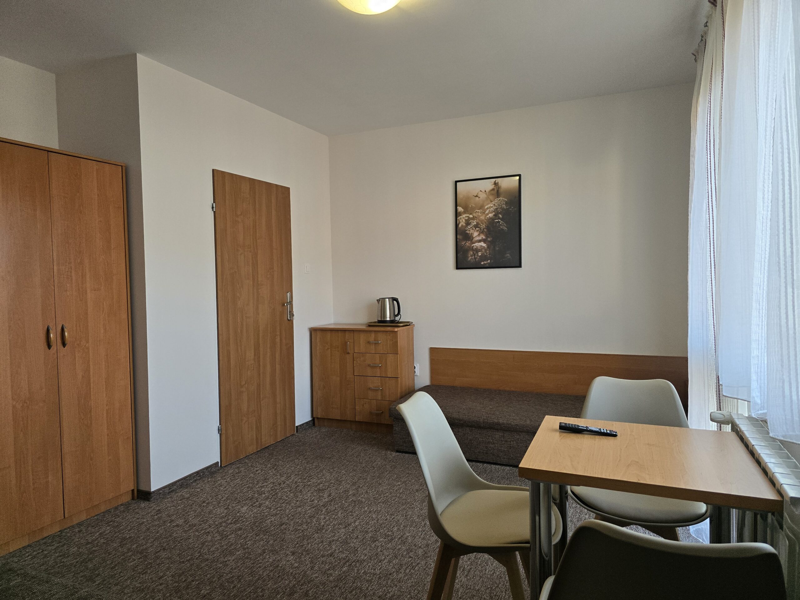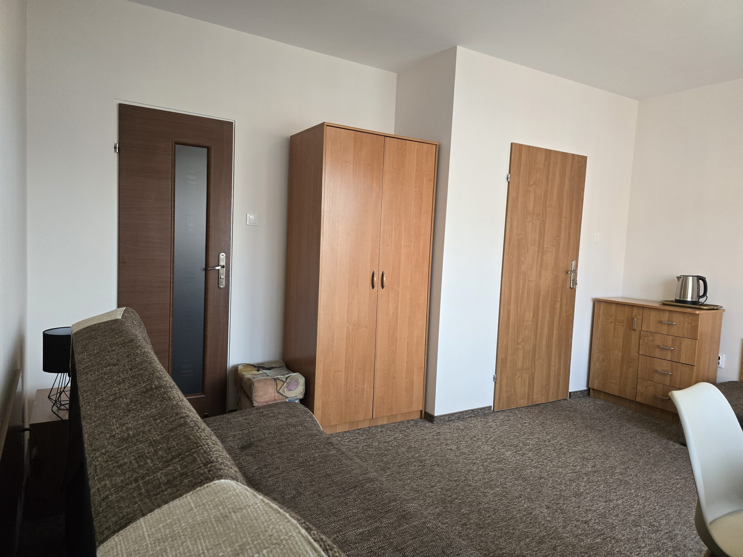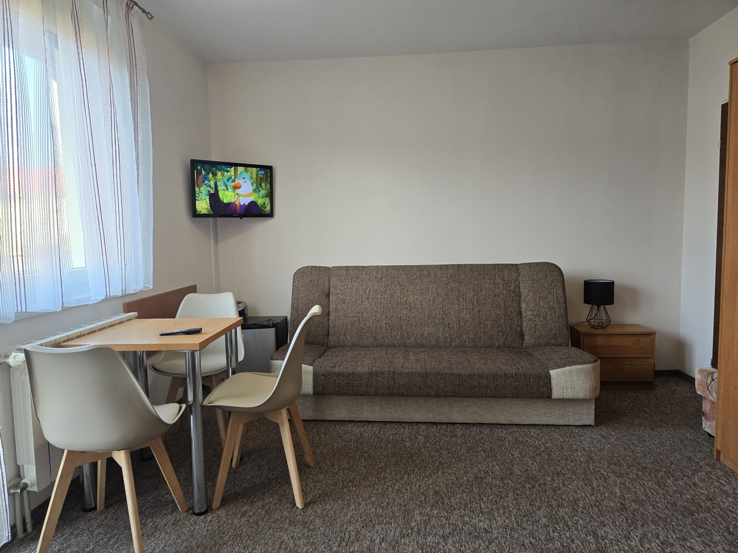 Pokój nr. 6, 2-3 osobowy z balkonem – II piętro. Wyposażenie: Telewizor 30″ led, czajnik elektryczny, pościel, podwójne łóżko, wygodny tapczan, szafa, stół i krzesła, lodówka, podstawowy zestaw naczyń.